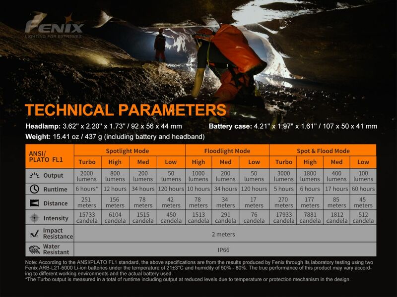Všechny parametry čelovky (světelný tok, doba provozu na baterie, vodotěsnost, dosvit a nárazuvzdornost) jsou změřeny v souladu s normou ANSI/NEMA FL 1-2009.