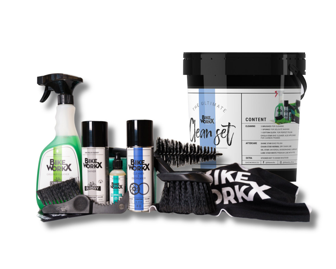 Nejste si jisti, které produkty péče jsou pro vás a vaše kolo ty pravé? Naše profesionální sada Clean Set obsahuje vše potřebné k řádnému čištění, mazání a konzervaci každého kola. Obsahuje: kbelík s víkem, tři profesionální kartáče, velkou houbu, hadřík na leštění, 500 ml Greener Cleaner, 200 ml Shiner Glossy, 200 ml Cleaner & Degreaser, 50 ml Chain Star Normal, a sadu nálepek.