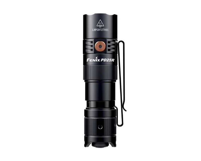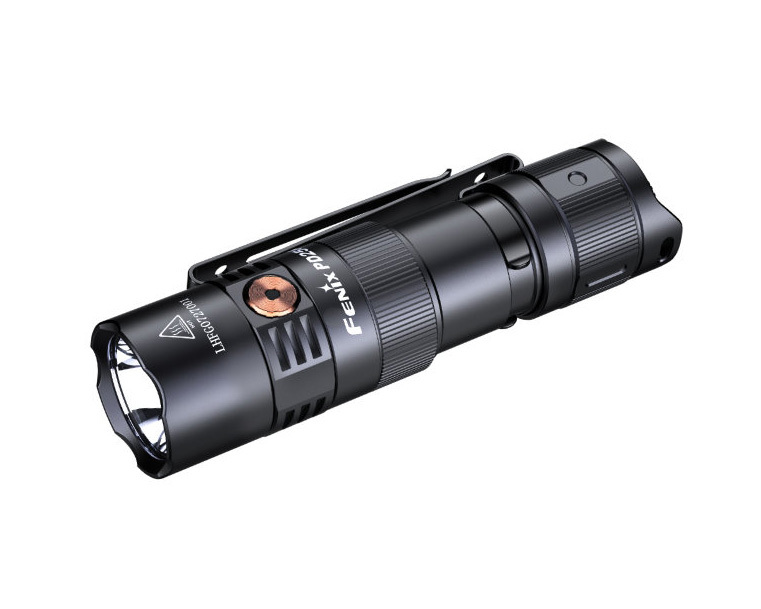 Kapesní nabíjecí svítilna Fenix PD25R nabízí světelný tok až 800 lumenů (ANSI) a dosvit až 250 metrů. Je napájena nabíjecím akumulátorem typu RCR123A (součástí balení), který se nabíjí přímo ve svítilně přes USB-C konektor, umístěným na boku. Nabíjecí zdířka je krytá šroubovací maticí, takže je dokonale chráněna proti vodě a nečistotám. Akumulátor lze nouzově nahradit i jednorázovou baterii CR123A. Jako světelný zdroj je použita špičková LED Luminus SST-20 s životností 50 000 hodin. Koncovka svítilny je osazena taktickým spínačem pro rychlé zapnutí a vypnutí, režimy výkonu se přepínají druhým tlačítkem na boku. Svítilna disponuje šesti režimy svícení, včetně zábleskového stroboskopu. V nejnižším režimu vydrží svítit až 70 hodin. Díky hmotnosti pouhých 78 gramů lze svítilnu nosit stále u sebe (EDC) pro běžné každodenní použití, v práci i při sportu.