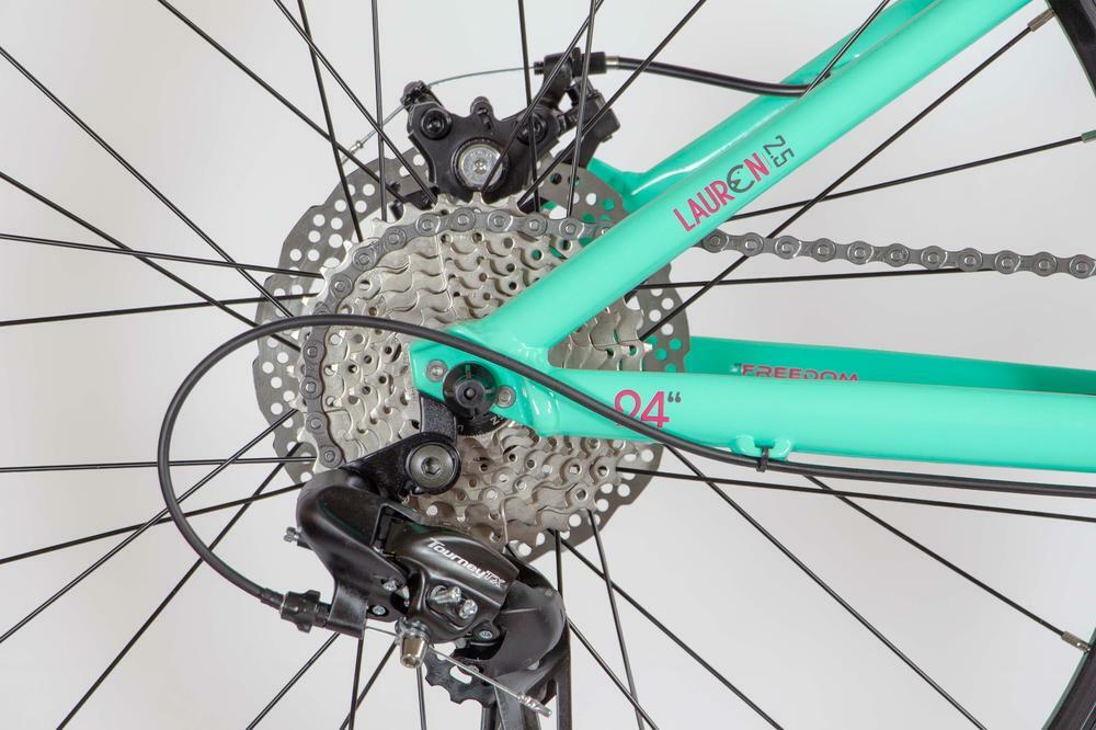 Modely Lauren 24" – základem je lehký hliníkový rám se sníženou horní trubkou, přehazovačka Shimano s 8 převody a otočné řazení. Kolo je vybaveno širšími plášti pro lepší stabilitu.