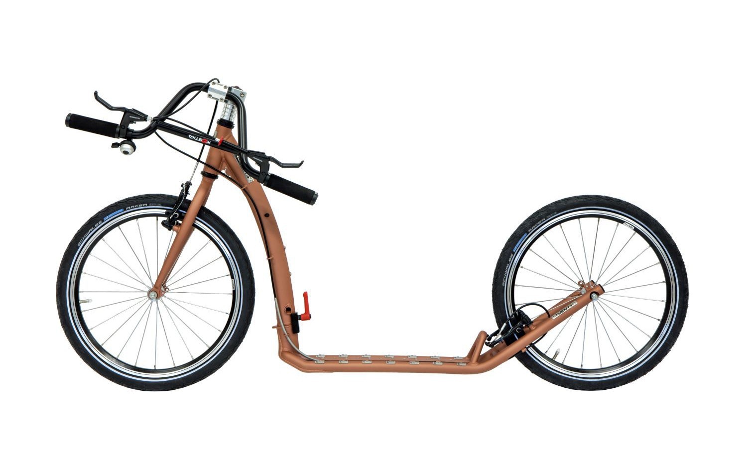 KOSTKA TWENTY FOLD, skládací koloběžka pro dospělého, disponuje výbornými jízdními vlastnostmi, které oceníte na krátkých i dlouhých výletech. Vše začíná u precizně odladěné geometrie rámu, jež zaručuje skvělou ovladatelnost a stabilitu. Kola koloběžky (20 palců) to umí pořádně roztočit díky nábojům Kostka HK 6524 RS, o dokonalé vedení jízdní stopy se zase postarají pláště Schwalbe Marathon Racer, obuté na kvalitních dvoustěnných ráfcích Dragon. Abyste do toho mohli šlápnout pořádně a bez obav, je KOSTKA TWENTY MAX FOLD založená na zúžené koncepci rámu a vidlic, která zamezuje kontaktu odrazové nohy s koloběžkou. A jakmile do toho dupnete tak důrazně, že se příjemně rychlá jízda promění v pořádný fičák, můžete kdykoliv zpomalit za pomocí efektivních véčkových brzd Shimano 4000.