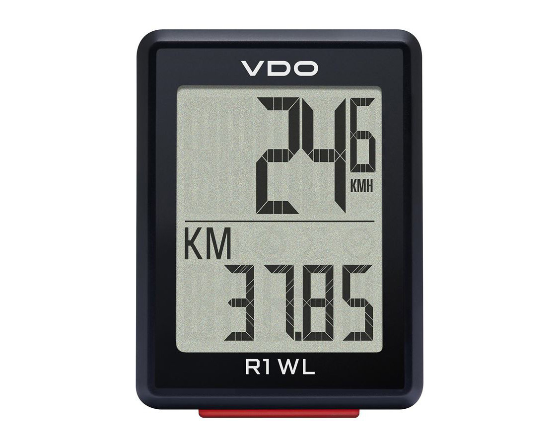 Základní bezdrátový computer VDO R1 WL je spolehlivým společníkem pro všechny, kteří chtějí mít na svých cyklo výletech přehled o pěti nejdůležitějších hodnotách – ať už při cestě do práce nebo při víkendovém výletu na kole. Velký, snadno čitelný displej computeru zobrazuje okamžitou rychlost, denní a celkovou vzdálenost, čas jízdy a hodiny. Pro větší přehlednost jsou jednotlivé funkce označeny ikonami. Nastavení a ovládání R1 WL je velmi snadné díky výraznému červenému funkčnímu tlačítku. Díky integrované tabulce plášťů je nastavení obvodu kol snadnou záležitostí. Držák na řídítka pro vodotěsný computer lze rychle namontovat na kolo pomocí přiložených stahovacích pásků. Computer lze poté snadno vyjmout a uschovat, čímž jej ochráníte před možným odcizením. Bezdrátový přenos dat zajišťuje analogový vysílač, který je umístěn na vidlici kola. Přiložená baterie (CR2032) postačí k napájení computeru po dobu delší než dva roky.